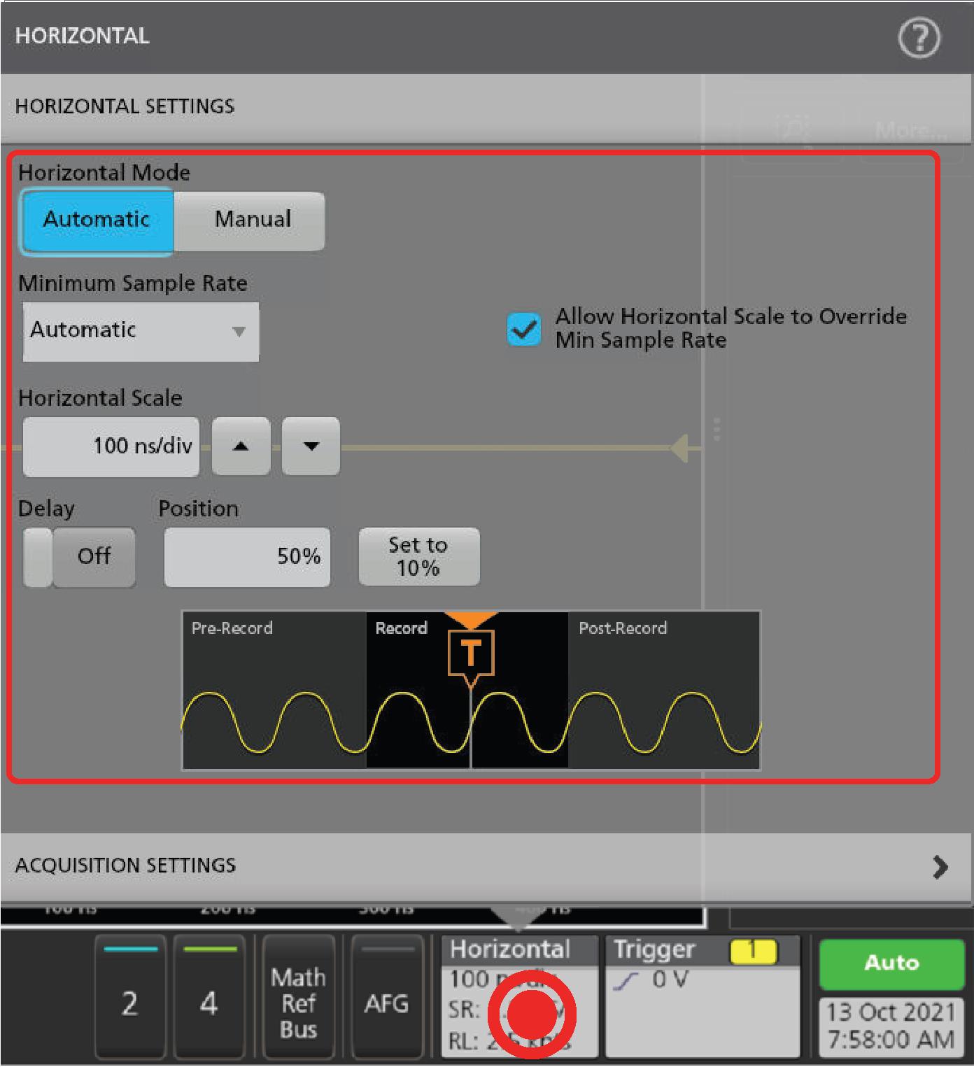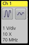 | Change horizontal or vertical settings directly on a waveform. Vertical changes only apply to the selected channel or waveform; horizontal changes apply to all channels and waveforms.  | Tap a badge and use the Scale buttons.  | Left-click a channel, waveform, or Horizontal badge and click on the Scale buttons.  |