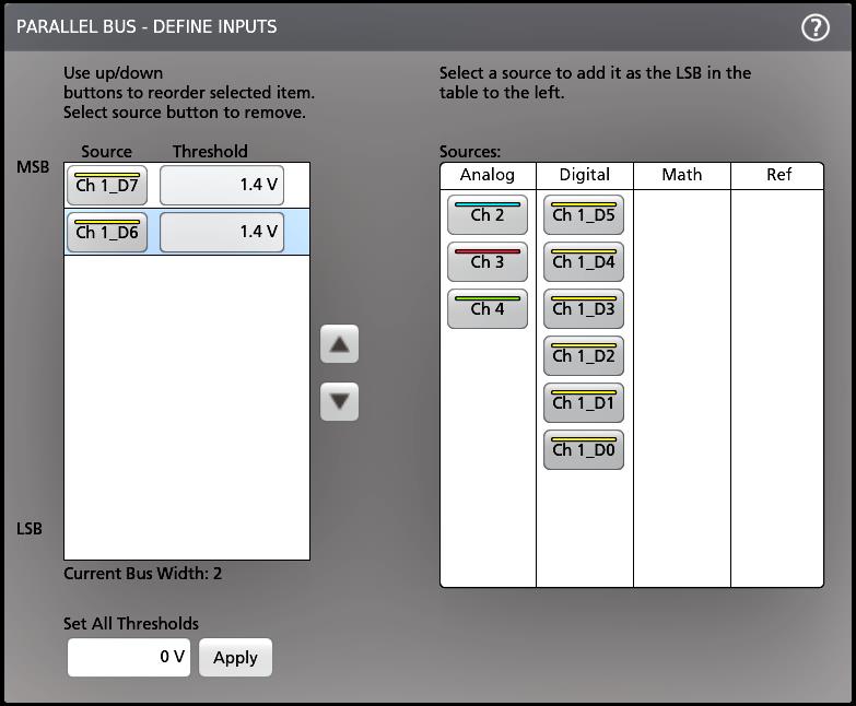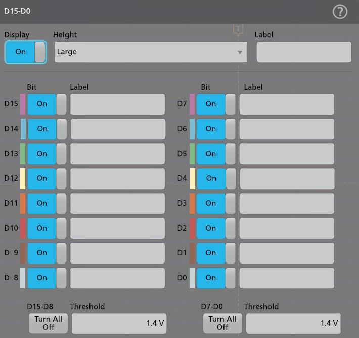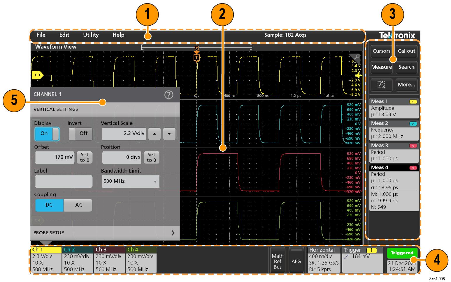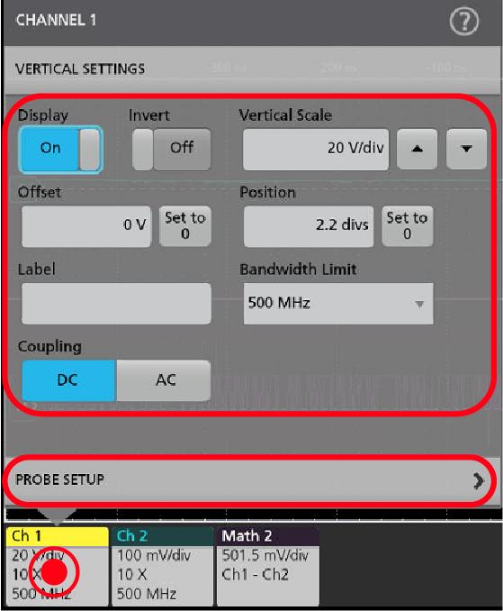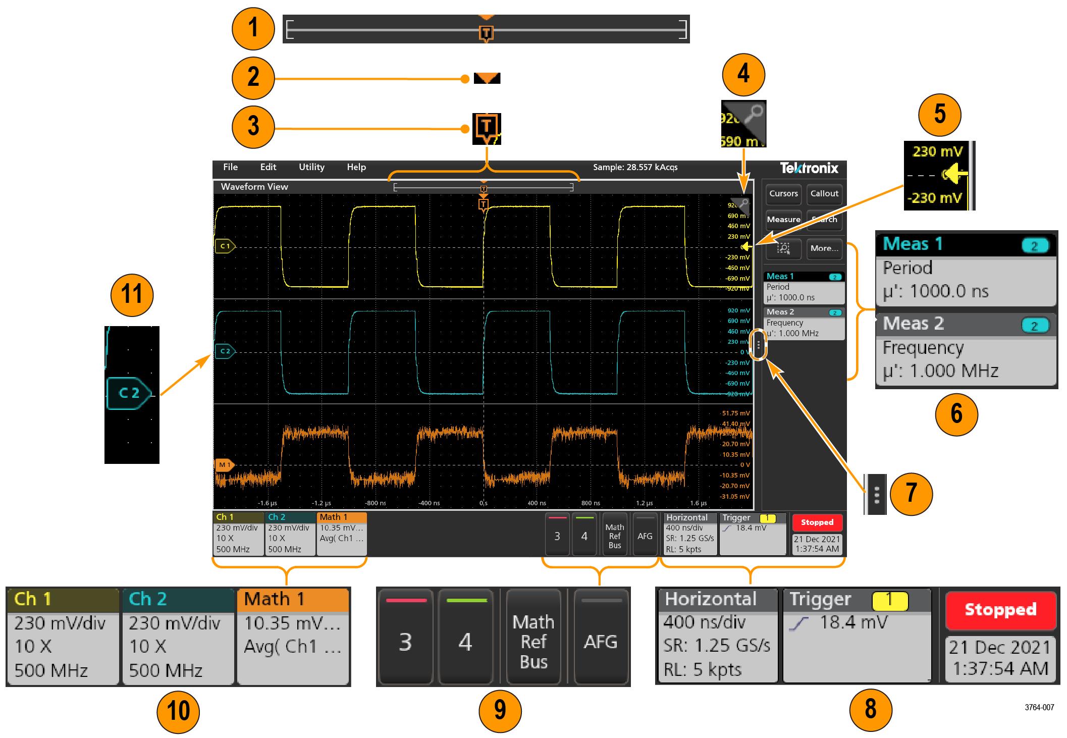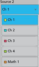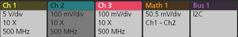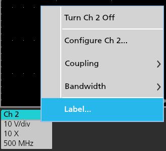 | Add a channel, math, reference, or bus waveform to the screen.  | Tap an inactive channel button, Add New Math, Add New Reference, or Add New Bus button.  | Click an inactive channel button, Add New Math, Add New Reference, or Add New Bus button.  |