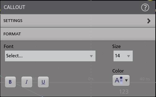 | Move a callout. Callouts are screen objects and are not associated with any particular waveform channel or slice.  | Touch and hold on a callout and quickly start to drag, then move to new position. Start to move the callout as soon as selected (highlighted), otherwise the UI opens the right-click menu. | Click and hold the right mouse button on the callout and quickly start to drag, then move to the new position.  |