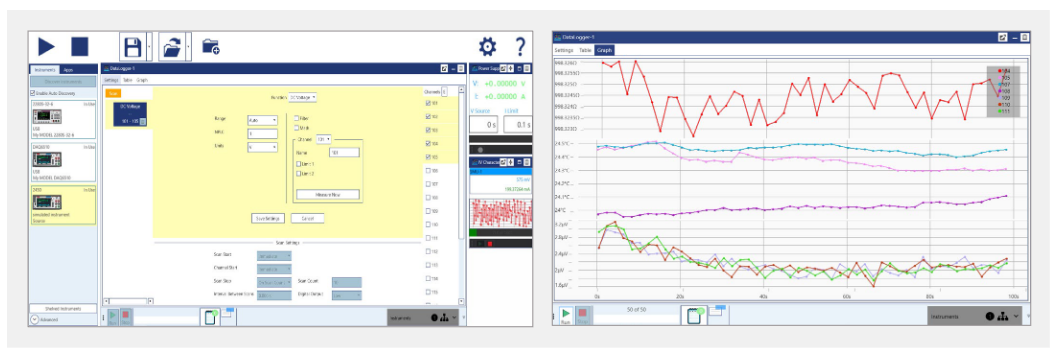 LabVIEW offers an extensive library function set to help users with most programming efforts. Keithley provides LabVIEW driver code libraries with application-specific examples for the target instrument, which can include multi-channel data acquisition, datalogging, single- and multi-point measurement, digitized measurements, and switching.