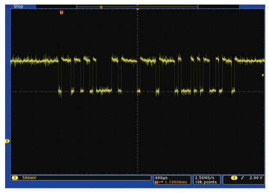 - Missing Ack - slaves are often configured to transmit an acknowledge after each byte of address and data. The oscilloscope can trigger on cases where the slave does not generate the acknowledge bit.