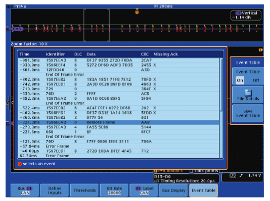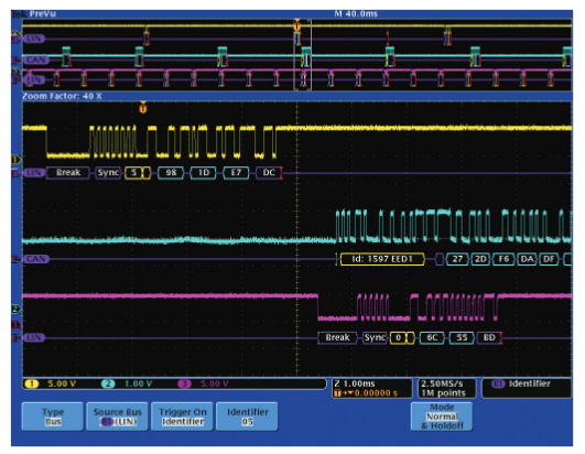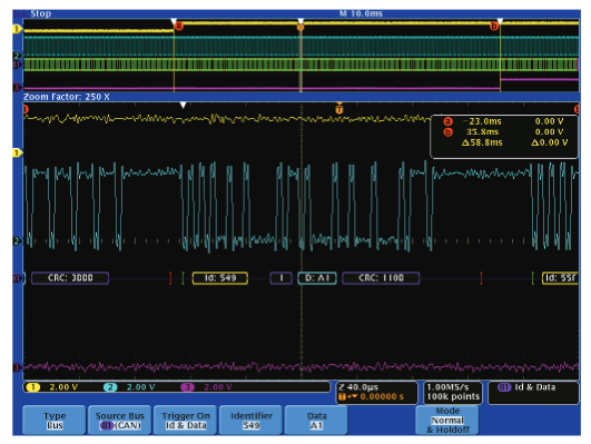 Again, these triggers allow you to isolate the particular bus traffic you’re interested in, while the decoding capability enables you to instantly see the content of every message transmitted over the bus in your acquisition.
