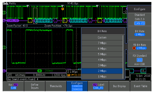 FlexRay serial triggering and analysis is available on several Tektronix oscilloscope families (see Appendix A). To define a FlexRay bus, we go to the bus menu and select FlexRay from the list of supported standards. The FlexRay setup menu is shown in Figure 42.