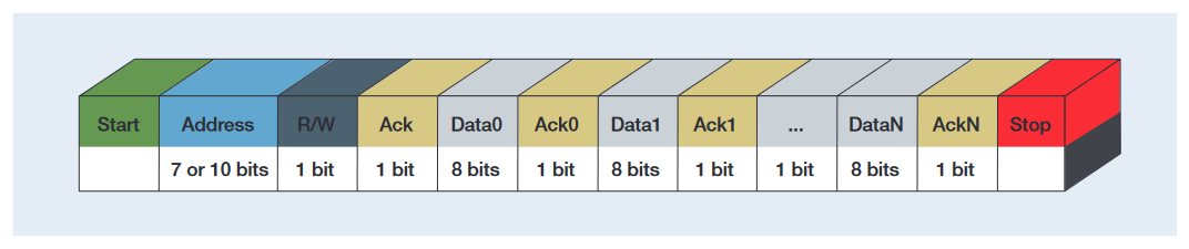 - Ack - one bit from the slave device acknowledging the master’s actions. Usually each address and data byte has an acknowledge, but not always.