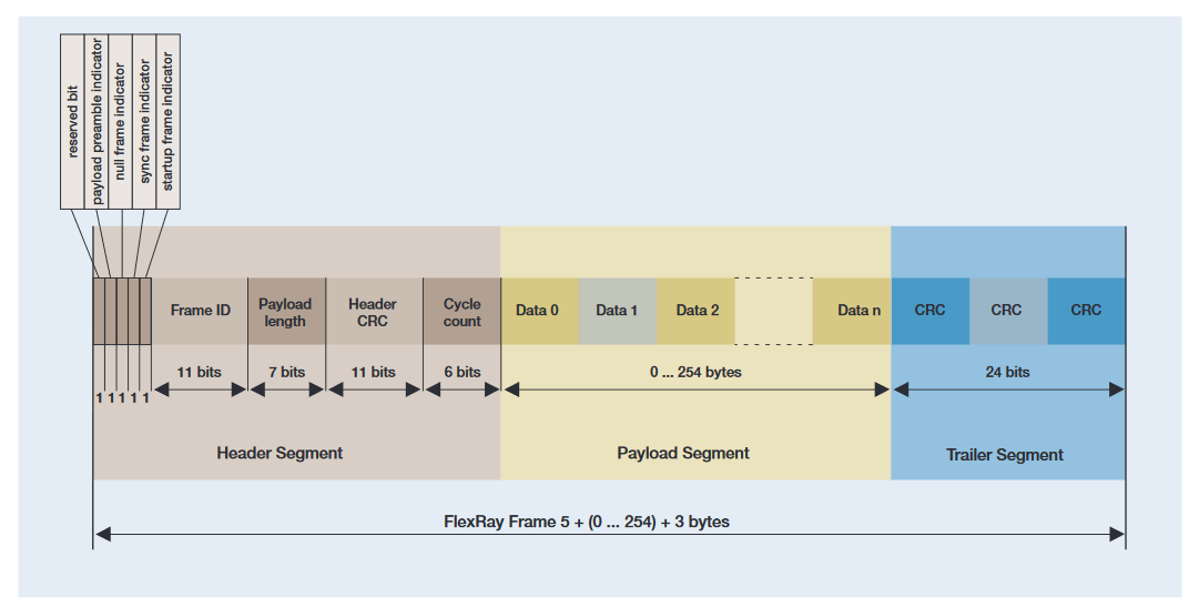 - Data – the data field contains up to 254 bytes of data. For frames transmitted in the static segment the first 0 to 12 bytes of the payload segment may optionally be used as a network management vector. The payload preamble indicator in the frame header indicates whether the payload segment contains the network management vector. For frames transmitted in the dynamic segment the first two bytes of the payload segment may optionally be used as a message ID field, allowing receiving nodes to filter or steer data based on the contents of this field. The payload preamble indicator in the frame header indicates whether the payload segment contains the message ID.