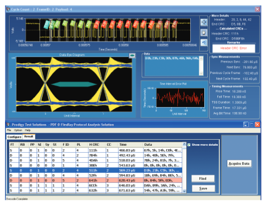 - Timing Measurements – rise time, fall time, TSS duration,frame time, average bit time, previous sync, next sync,previous cycle frame, next cycle frame.