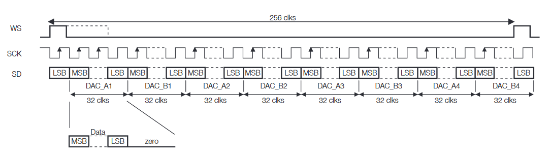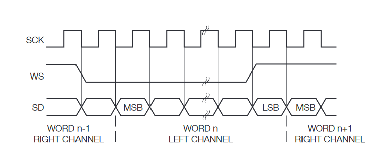 Serial data is transmitted in two’s complement with the most significant bit (MSB) first. The MSB is transmitted first because the transmitter and receiver may have different word lengths. It isn’t necessary for the transmitter to know how many bits the receiver can handle, nor does the receiver need to know how many bits are being transmitted. When the system word length is greater than the transmitter word length, the word is truncated (least significant data bits are set to ‘0’) for data transmission. If the receiver is sent more bits than its word length, the bits after the least significant bit (LSB) are ignored. On the other hand, if the receiver is sent fewer bits than its word length, the missing bits are set to zero internally. And so, the MSB has a fixed position, whereas the position of the LSB depends on the word length. The transmitter always sends the MSB of the next word one clock period after the WS changes.