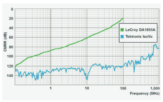 When comparing a product's CMRR value to your measurement requirements, it's important to remember to match the edge rates of critical measurements to the measurement system's corresponding CMRR value. This corresponding value can be easily determined by examining the CMRR versus frequency plot typically found in the product's user manual. An example of this kind of derating curve is found in Figure 2 which compares the LeCroy DA1855A to the Tektronix IsoVu measurement system.