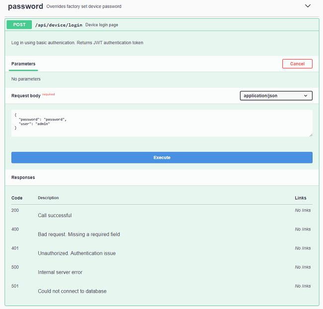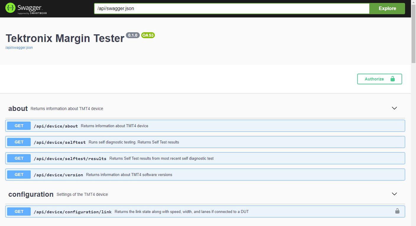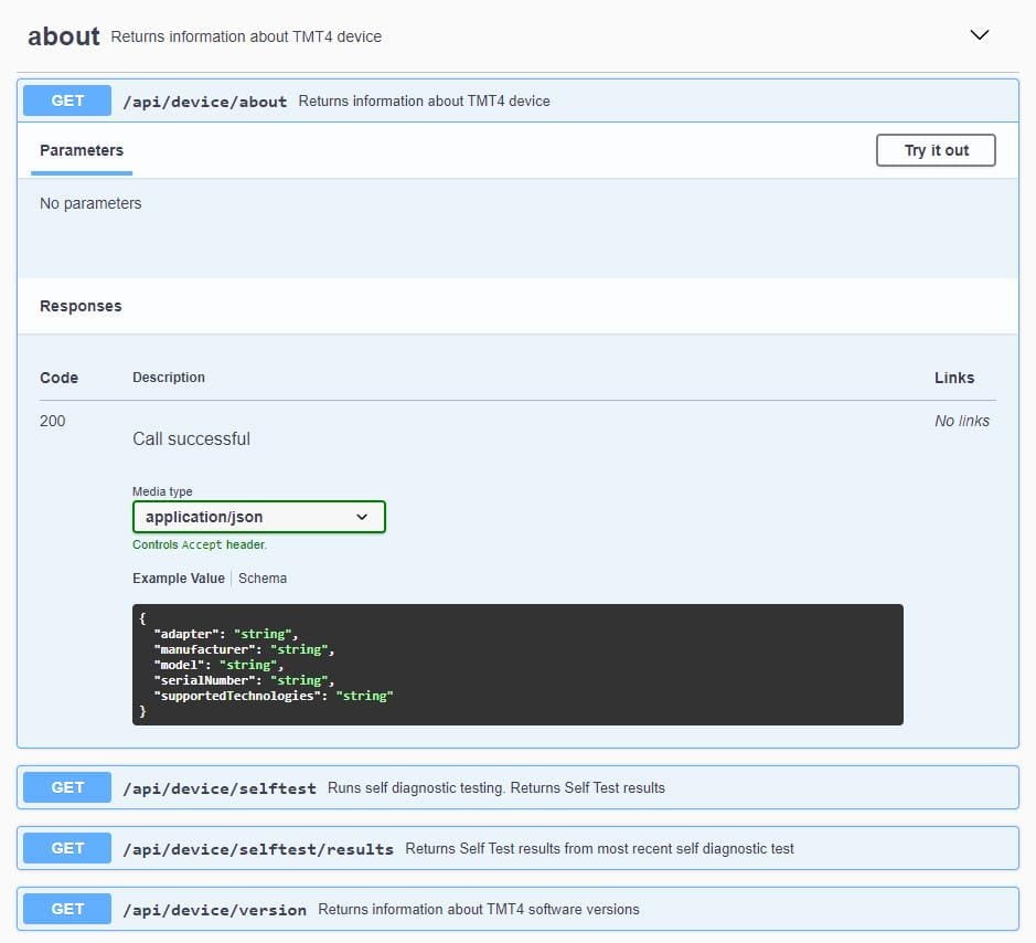You can access the API interface and documentation through the Swagger interface. The interface provides the calls, parameters, a way to download a *.json file of all of the commands, and an interface for sending calls to the TMT4.
