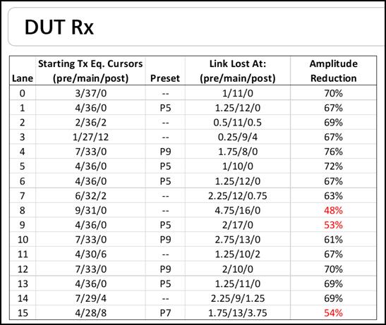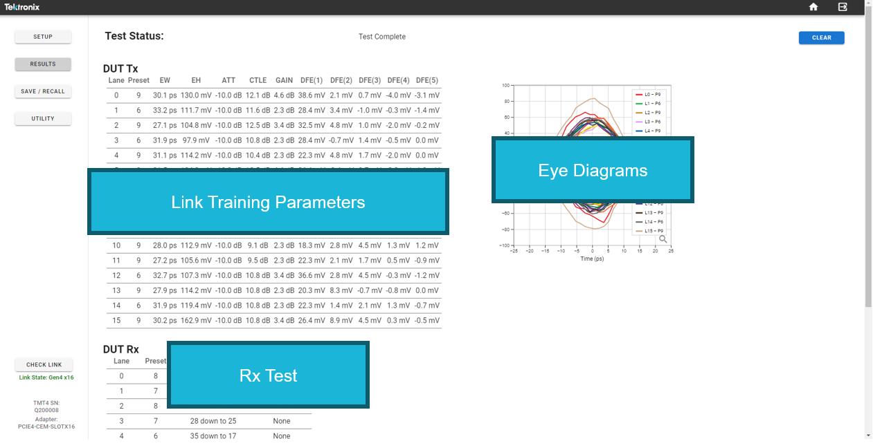 - Quick Tx test lets all available lanes train to their preferred preset and reports Eye Widths, Eye Heights and Receiver Settings.