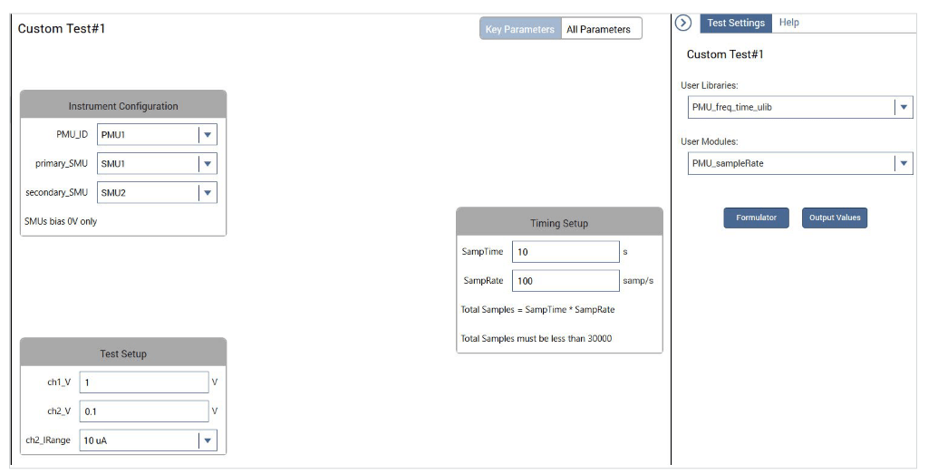 Just like the SMU, the current spectral density of the 4225-PMU can also be derived from current and time measurements and FFT calculations. A test, pmu-isd, that calculates the PMU current spectral density with an open circuit on both the 100 µA and 100 nA ranges can be found in the Test Library. This test was generated by using the PMU_sampleRate user module in the PMU_freq_time_ulib user library. With this PMU test, the user can input a voltage bias for both CH1 and CH2, select a current range for CH2, and specify the total test time and the sample rate. A screen capture of the Configure view of the pmu-isd test is shown in Figure 5.
