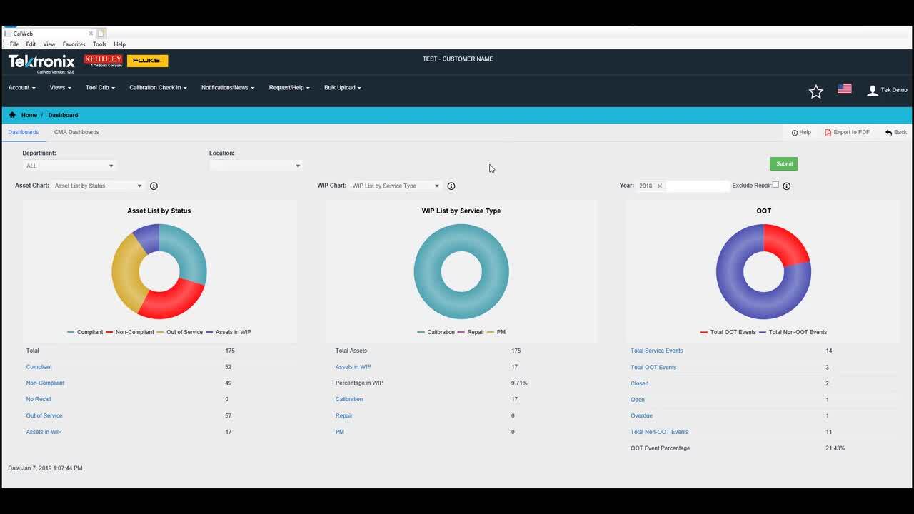 - Utilize the included standard reports, including calibrations due, work in process, and delivery metrics